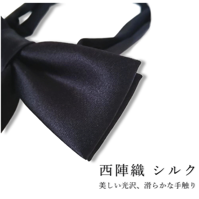 伝統のある京都「西陣織」シルク 生地は着物の産地として長い伝統を誇る「 京都 西陣織 」を使用したリボン蝶ネクタイです。 伝統に裏打ちされた品格は、身に着けた人に満足感や特別感を味わって頂けるはず。 簡単着脱、長さ調節可能!リボンの形はそのままに、首回りサイズが調節できる簡易留具式。 ![]() ワンタッチで簡単スマートに装着! 首回りのサイズ調整可能 慌ただしい着替えの時も安心なワンタッチ式の簡易留め具を採用。 リボンの形を崩さず、着脱が簡単&首回りの長さも自由に調整可能です。 手軽におしゃれを楽しみたい、いつも美しいリボンの形をキープしたい、 そんな方におすすめの長さ調整付きリボン蝶ネクタイです。 ![]() 丁寧な縫製、京都 日本製 西陣織を織り上げる機場の風景。長い歴史の中で培われた織物の伝統が今も息づいています。 dplus artsのリボン蝶ネクタイは伝統の技から生まれた上質な無地の西陣織を使用し、 現代の装いに洗練された個性を加えます。普段使いから特別な日まで本物のシルクが品格を 演出します。ドライクリーニングを推奨しております。 |