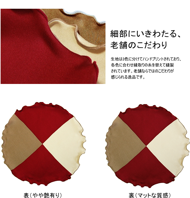 3色の生地にあわせて縁取りの糸を替えて仕上げています。