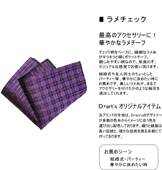 ![]() アクセサリーのような、華やかなラメ チェック ポケットチーフ シルク 絹 西陣織 日本製 チェック柄をベースに、繊細なラメ糸がキラキラと輝くポケットチーフ。 親しみやすい柄なので、気負わずカジュアルな感覚でお使い頂けます。 結婚式や友人同士のちょっとしたパーティー等、華やかに決めたい時にお薦めです。 美しいラメ糸が、まるでアクセサリーを付けたかのような胸元を演出してくれます。 [こんな時に大活躍] ビジネスシーンやフォーマルイベント、結婚式や二次会、 パーティーコーデのアクセントとしておすすめです。 また、卒業式や入学式、卒園式 入園式、成人式、七五三などお子様の大切な イベントでも重宝し、親御さんやお子様のフォーマルな装いにも最適です。 ![]() シックなチェック柄にラメ糸が華やかさを添えてくれます。 今回はホログラムのラメ糸を使用しているので、 小さな星が散りばめられたようにキラキラと輝きます。 ラメ糸自体は細いので、とても上品な雰囲気に仕上がっています 当ブランドの生地はdplus artsのデザイナーが多数の色糸から イメージに合う色を選び出し配色しております。 生地の織りは、長い伝統を誇る西陣織 絹 シルク100%で、 縫製も長い伝統と確かな技術を誇る京都にて行っております。 COLOR VARIATION ![]() ![]() |