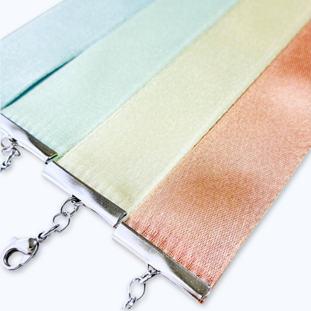 ![]() 結婚式やパーティーシーンを彩る、上品なパステルチョーカー。 肌なじみがいい淡いペールイエローが首元をやさしく明るく見せ、 ドレススタイルを一段と華やかに仕上げます。 「ドレスは決まったけれど首元が寂しい…」そんな悩みも、この一本で解決。 光沢のある質感が写真映えし、他のゲストとさりげなく差がつく洗練された印象に。 首元をすっきり見せながら、特別な一日をより美しく引き立てます。 ![]() このチョーカーには、福井県のリボンメーカーが作る美しいサテンリボンを使用しています。 企画から製造まで自社で一貫して行い、実直な物作りへの姿勢が品質にも表れています。 ![]() 袋織により両面が滑らかなサテン素材です。適度な厚みがあり、 縁も柔らかいため肌あたりが良く、美しい光沢と発色が特徴です。 【袋織りとは】サテンリボンを袋状(筒状)に織り上げる製法で、両面がサテンで 仕立てられている為、自然な厚みと立体感が生まれるのが特徴です。 ![]() 金具の色はゴールドとシルバーの2色から選択可能です。 華やかで温かみのあるゴールドは女性らしさを、 凛とした輝きのシルバーは、肌の透明感を引き立てる洗練された印象。 甘いカラーのリボンも、すっきり大人っぽく仕上げます。 パーソナルカラーや手持ちのアクセに合わせ、理想の首元を叶えます。 ※本ページは金具シルバーです ![]() このチョーカーには福井県産の美しい光沢のサテンリボンを使用し、 リボンの裁断、金具の取り付け、仕上げの微調整まで、一つひとつの工程を国内の 自社の職人が手間を惜しまず丁寧に行い、完成まで心を込めて仕立てています。 ![]() 首が細い・太い問題を解決してくれる「S・M・L」3サイズからお選びいただけます。 COLOR VARIATION ![]() ![]() PINK ピンク 肌なじみ抜群の大人可愛いピンク。顔周りを明るく華やかに。 ![]() PALE YELLOW ペールイエロー 優しく淡いトーンのペールイエロー。派手すぎず上品な差し色に。 ![]() PALE GREEN ぺーグリーン 光を味方につけて澄んだ印象に。大人の透明感を惹き出すペールカラー。 ![]() POWDER BLUE パウダーブルー 清楚で上品なパウダーブルー。甘さを抑えた知的な首元を演出。 ![]() WHITE ホワイト 圧倒的な清潔感の白色。レフ板効果で顔周りをパッと明るく。 ![]() SILVER シルバー どんなコーデにも馴染む万能シルバー。洗練されたクールな輝きを。 金具ゴールドのチョーカーはこちら ![]() サテンチョーカー ペールカラー 日本製 S・M・Lサイズ ⇒すべてのチョーカーはこちら |