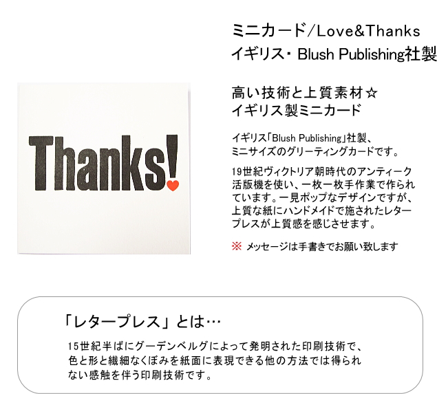 TOP メール便対象 父の日ギフト ポケットティッシュ ケース・小物・ケース・メッセージカード code SM name 【ミニカード】Love&Thanks/イギリス Blush Publishing社製・封筒付 Mini card/Love&Thanks/Product madeBlush Publishing company in England size カード:8cm×8cm/封筒:9cm×9cm Card:8.5cm×8.5cm/envelope:9cm×9cm materia 紙 Paper manufacture イギリス(Blush Publishing社製) Made in England notes 印字は不可(手書きでお願い致します) 付属:封筒1枚 (この封筒で郵送はできません) Non-printable メッセージカード ミニ ギフトカード Love&Thanks イギリス・Blush Publishing社製 封筒付 価格: ¥308 (税込) [ポイント還元 3ポイント~] 販売期間: 数量: 枚 カラー在庫購入ハート○ LOVE○ Thanks○ カラー在庫購入ハート○ LOVE○ Thanks○ 返品詳細はこちら レビューはありません こちらもオススメ! メッセージカード ミニ ギフトカード 切抜メッセージ イタリア・LEGAMi社製・封筒付 ¥330(税込) メッセージカード ミニ ギフトカード 花柄コットン リバティ社製ファブリック・封筒付 ¥396(税込)