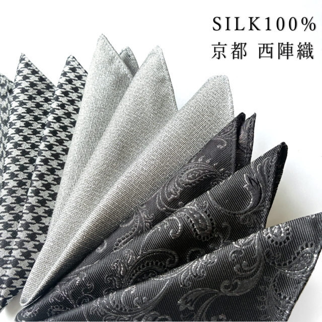 ![]() 洗練された大人のための華やかなスタイルに ブラックスーツにdplus artsのポケットチーフが放つ繊細な輝きが、胸元に特別な存在感を与えます。 フォーマルなシーンにふさわしい上品さを保ちつつ、周りとは一味違う個性を演出。 別売りの黒ナロータイと合わせることで全体に統一感が生まれ、よりドレッシーな印象に仕上がります。 パーティーや食事会など、ワンランク上の装いを求める日にぴったりのコーディネートです。 ⇒ 画像で着用している、西陣織 黒 ナロータイ シルク 長さ3サイズ(別売り)はこちら ![]() 格式ある装いを演出する、西陣織の気品 西陣織 シルク100%のなめらかさに加え、程よいハリ感を持たせることで、美しい形をキープ。 ふんわりと膨らませる「パフ」スタイルや、シャープな印象の「スリーピークス」など、 どのような折り方でも崩れにくく、エレガントな胸元を保ちます。 また、光を浴びると繊細にきらめくラメ糸は、さりげない華やかさを演出してくれます。 ![]() 丁寧な縫製、京都 日本製 生地を織り上げているのは、京都 西陣織の機場さん。 海外製が多い衣料品の世界ですが、 ネクタイは京都産を身に着けて 日本の伝統を ファッション を通して楽しんでみませんか。 ネクタイのお手入れは、ドライクリーニングを推奨しております。 西陣織 にしじんおりとは 西陣織は京都市北西部の西陣地域で生産される高級絹織物の総称です。 美しく染めた糸を使い豪華で立体的な模様を織り出すことが特徴で帯や着物、 ネクタイ、ショールなど多彩な製品が展開されています。 また、「西陣」や「西陣織」は西陣織工業組合の登録商標で同組合に 所属する業者のみが西陣織ブランドを名乗ることができます。 ![]() 柄で変わる、胸元の表情 ポケットチーフは、柄や折り方一つで印象が大きく変わります。 3つの異なる柄が、あなたのスーツスタイルを個性豊かに彩ります。 ペイズリー柄はクラシックで華やかな印象に、千鳥格子は知的でシャープな雰囲気、 無地は上品で洗練されたシンプルさを演出してくれます。 ⇒ その他のポケットチーフの挿し方 折り方はこちらから見る Variation ![]() Paisley ペイズリー クラシックなペイズリー柄は胸元に優雅なアクセントを添えます。 スーツに深みを与え、洗練された大人の雰囲気を演出します。 ![]() Houndstooth 千鳥格子柄 知的でシャープな千鳥格子は落ち着きのある洗練された印象を与えます。 ビジネスシーンや少しフォーマルな集まりにぴったりです。 ![]() Solid 無地 シルバー シンプルで上品な無地はどんなスーツにも合わせやすい万能アイテム。 控えめでありながらラメの輝きが確かな存在感を放ちます。